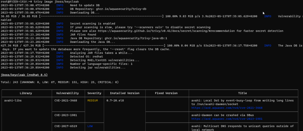 trivy image jboss/keycloakY esperamos al resultado. Este puede ser algo tedioso de ver en la consola, pero en nuestro caso a detectado varios problemas de seguridad, 25 de ellos potencialmente altos: