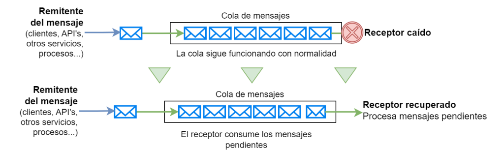 Esto es posible gracias a que, como hemos mencionado antes, los mensajes pendientes quedan almacenados en la cola, esperando la disponibilidad del servicio caído.