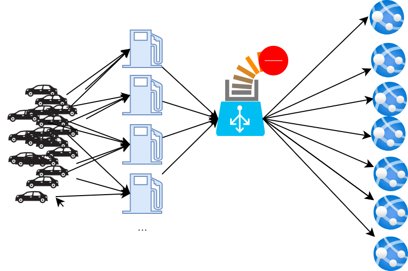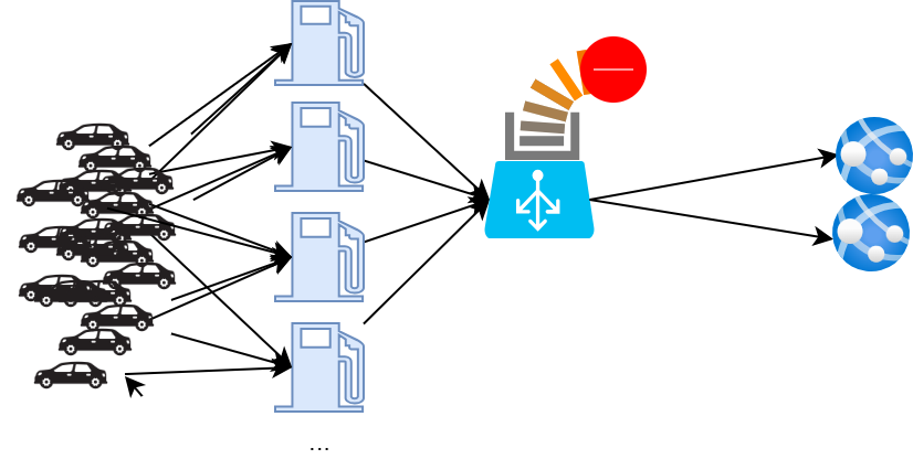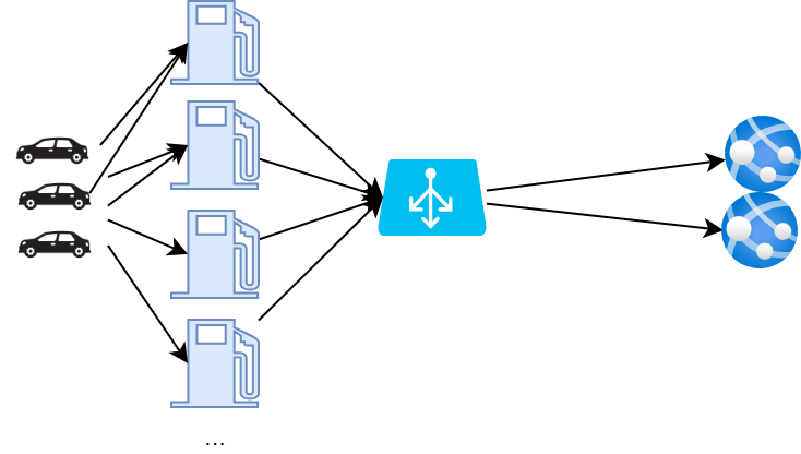 Os presento un ejemplo para ilustrar esto: imaginad un sistema de surtidores de combustible autónomos que envían sus transacciones para que puedan ser facturadas a los clientes. En un día normal, los surtidores generan unas 10.000 transacciones, y los procesos que gestionan estos datos para facturarlos están dispuestos tras un balanceador de carga.