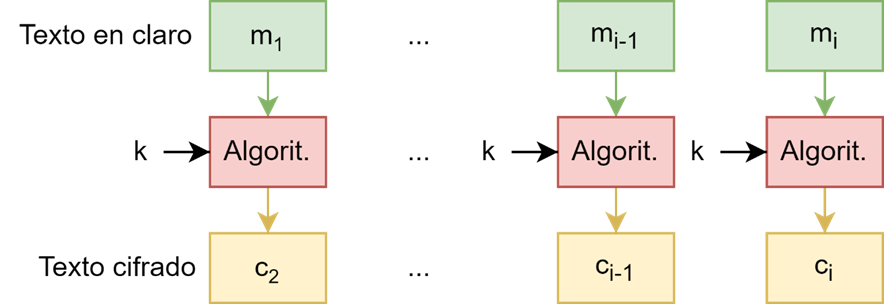 Es decir, recibimos un bloque bl de un número de bits n con un mensaje m y devolvemos otro bloque c en este caso cifrado, con el mismo número de bits.