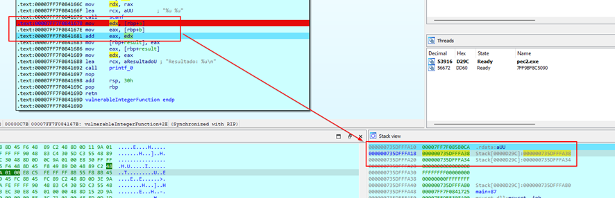 El registro RAX muestra el valor 0x00000000FFFFFFFE. Este es el resultado de la operación de suma que se ha realizado en la función vulnerableIntegerFunction.