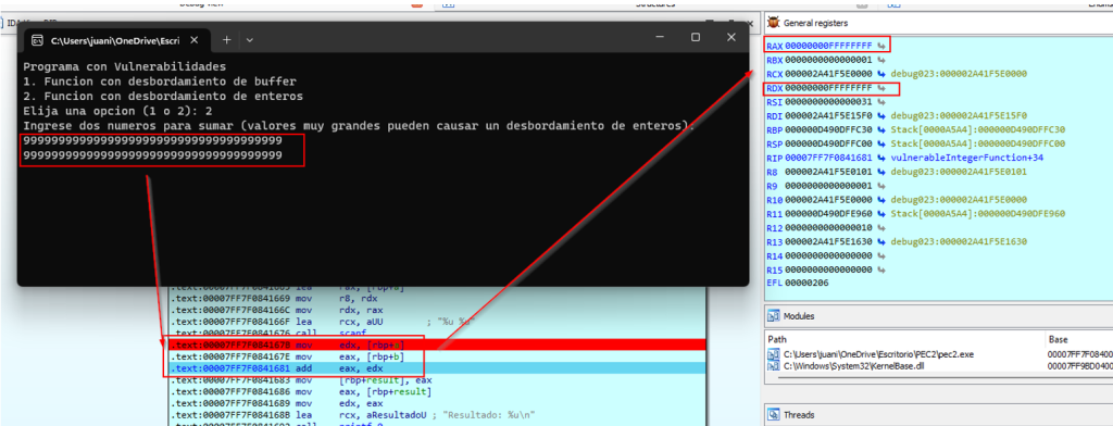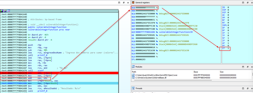Esto indica que después de sumar dos valores de 0xFFFFFFFF, el registro EAX tiene un valor de 0xFFFFFFFE. Esto es una demostración clara de un desbordamiento de enteros, ya que la suma de los dos valores debería haber resultado en 0x1FFFFFFFE, pero debido a que EAX solo puede contener 32 bits, solo podemos ver los 32 bits menos significativos del resultado real, y el bit más significativo se ha perdido. Esto resulta en el valor de EAX mostrando 0xFFFFFFFE.