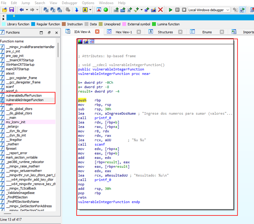 Además, usaremos el Software de ingeniería inversa IDA para desmembrar el código y analizar las acciones. Podemos ver nuestras funciones vulnerables y el código en ensamblador: